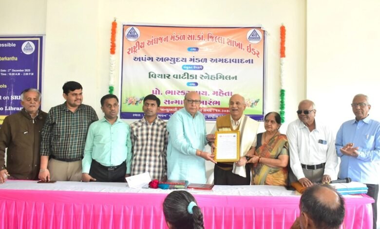 રાષ્ટ્રીય અંધજન મંડળ સાબરકાંઠાના ‘ભાસ્કર ભવન’ ખાતે તારીખ 17 અને 18 જાન્યુઆરી, 2026 ના રોજ વિચાર વાટિકા ગ્રુપ સ્નેહ મિલન તેમજ અપંગ અભ્યુદય મંડળ અમદાવાદના સંયુક્ત ઉપક્રમે વિશેષ કાર્યક્રમનું આયોજન કરવામાં આવ્યું હતું. આ કાર્યક્રમમાં પૂર્વ દિવ્યાંગ કમિશનર પ્રોફેસર ભાસ્કર વાય. મહેતાના અમૃત મહોત્સવ નિમિત્તે તેમનો સન્માન સમારોહ યોજાયો હતો. કાર્યક્રમની શરૂઆત કુમારી અમિતા ખાંટ દ્વારા પ્રાર્થનાથી કરવામાં આવી હતી, ત્યારબાદ ઉપસ્થિત મહેમાનો દ્વારા દીપ પ્રાગટ્ય કરી કાર્યક્રમને ખુલ્લો મૂકવામાં આવ્યો હતો.