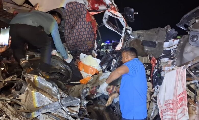 સાબરકાંઠા પ્રાંતિજ ટોલનાકા પાસે ટ્રક અને ટ્રેલર વચ્ચે અકસ્માત પ્લાયવુડ ભરેલ ટ્રક પાછળ ટ્રક ટ્રેલર અથડાતા અકસ્માત સર્જાયોટ્રક ટ્રેલરના કેબિનમાં ચાલક અને ક્લીનર દબાઈ જતા ફસાયા ટ્રક ટ્રેલરના ક્લીનરનું કેબીનમાં દબાઈ જતા ઘટના સ્થળે જ મોતટ્રેલર ચાલકને બે ફાયર ટીમે રેસ્ક્યુ કરી બહાર નીકાળ્યો ચાલકને સિવિલ હોસ્પિટલમાં સારવાર અર્થે ખસેડાયો પ્રાંતિજ પોલીસે ઘટના સ્થળે પહોંચી તપાસ હાથ ધરી