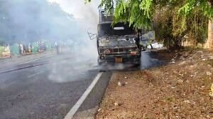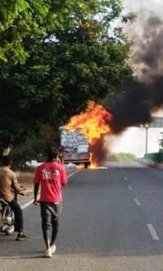 ખેડબ્રહ્મા-અંબાજી હાઇવે પર આઇસર ટ્રકમાં ભયંકર આગ, ટ્રાફિક જામ